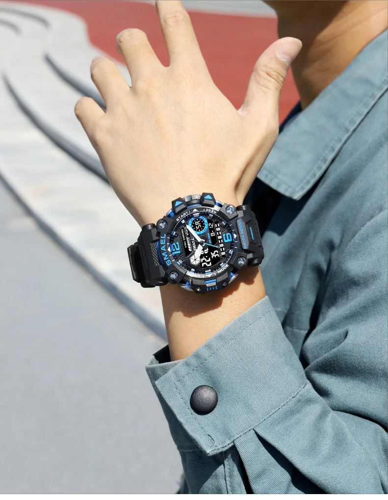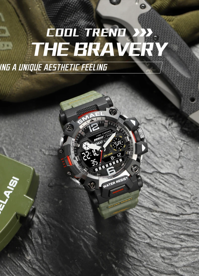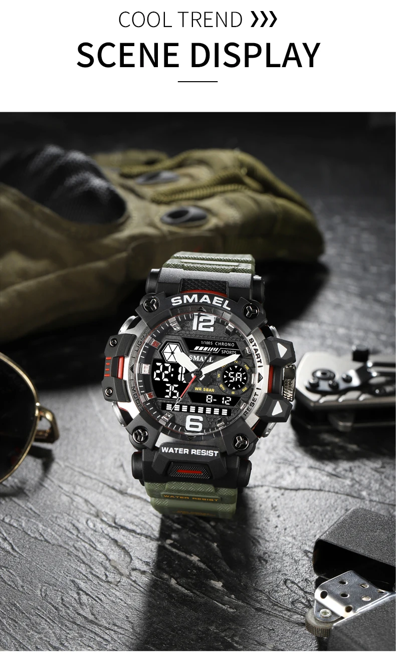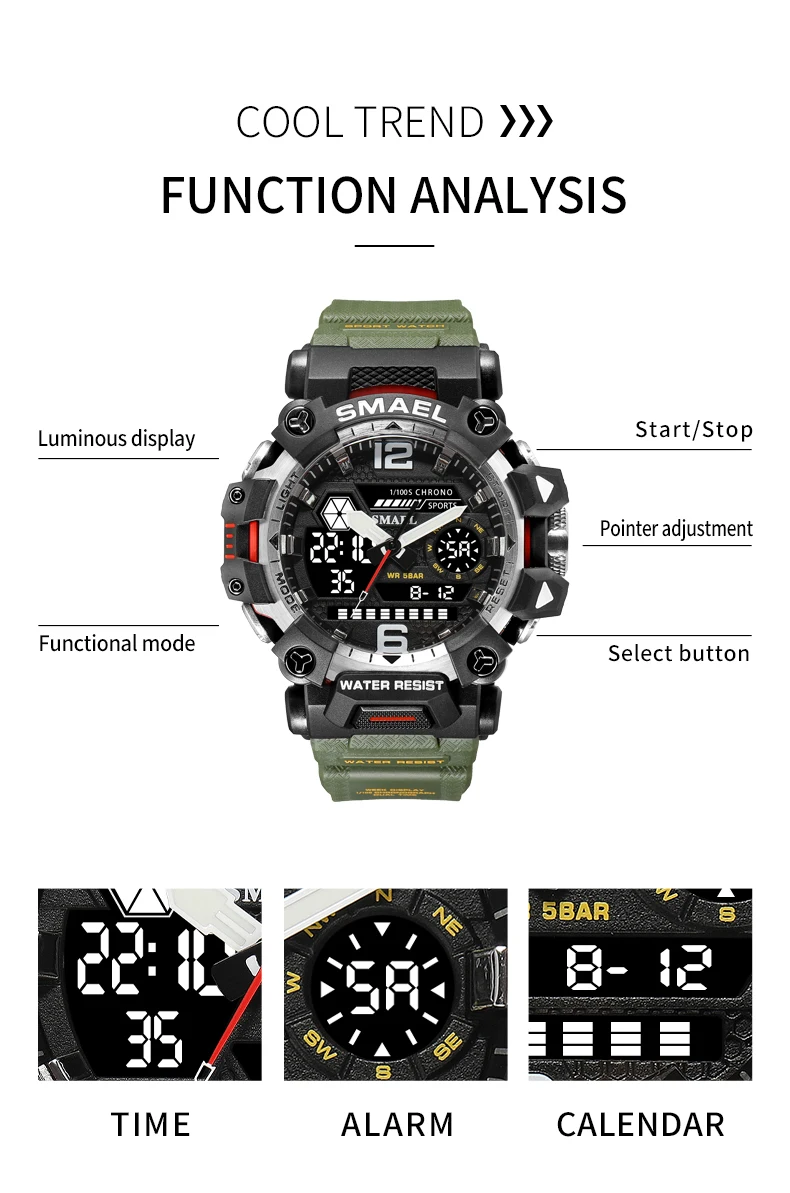oduct description: 1. Brand: SMAEL 2. Dual time shows with LED backlight function 3. 50M Water Resistant 4. Type: Men Sports Watches 5. Movement: Japan Original Digital Movement 6. There are 9 colors for selection 8. Band Width: (approx) 2.3cm 9. Dial Diameter: (approx) 4.9cm 10. Strap Material: Strong PU 11. Case…